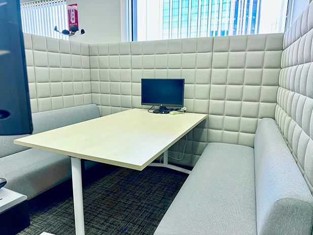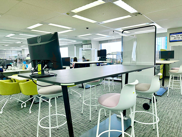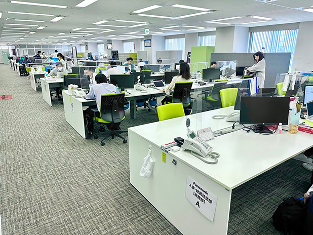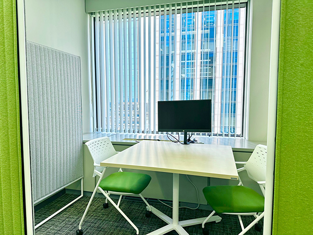 ペーパーレス化および部門ごとのフリーアドレス化を図ると共に、ミーティングスペースも拡充し、 従業員間でさまざまなコミュニケーションが取りやすい職場環境です。