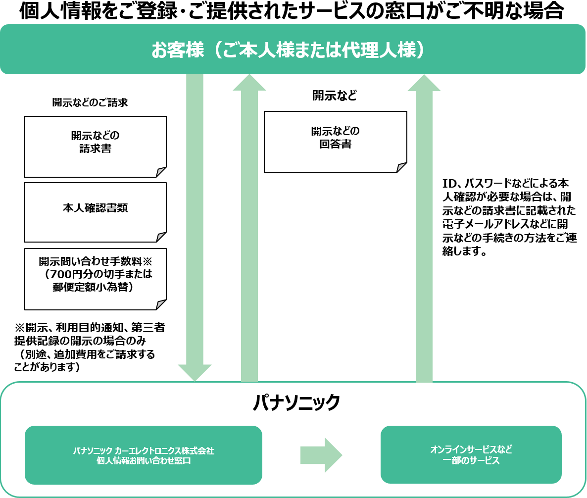 パナソニック カーエレクトロニクス株式会社 個人情報お問い合わせ窓口では、お客様(ご本人様または代理人)から個人情報の開示などのご請求があった場合、開示などの請求書、本人確認書類、そして個人情報の開示、利用目的通知および第三者提供記録の開示の場合のみ開示問合せ手数料(700円分の切手または郵便定額小為替)をいただいて、個人情報の開示などの回答書を出しています。その他別途必要に応じて実費の追加費用負担をご請求する場合があります。オンラインサービスなど一部のサービスでは、ID、パスワードなどによる本人確認が必要な場合は、開示などの請求書に記載された電子メールアドレスなどに開示などの手続きの方法をご連絡します。